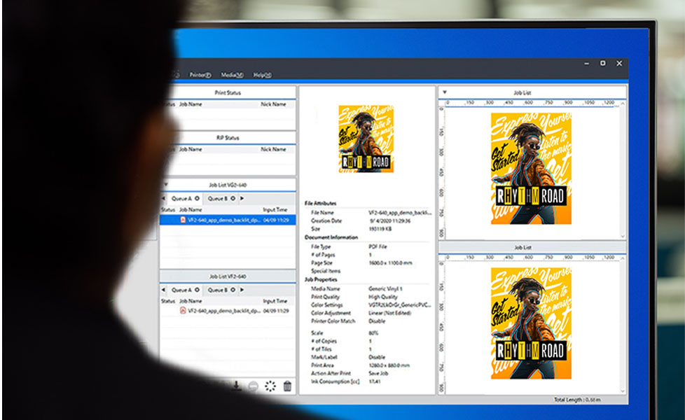 對于希望更好地控制 BN2 輸出設(shè)置和功能的用戶,每個(gè) BN2 設(shè)備還配備了 VersaWorks 6 輸出軟件。 VersaWorks 6 易于使用且功能強(qiáng)大,提供可優(yōu)化打印機(jī)、墨水和介質(zhì)質(zhì)量并簡化流程的功能和工具。 VersaWorks 還簡化了打印布局的設(shè)置,為打印和切割應(yīng)用生成切割線,并配備內(nèi)置色彩管理工具,使再現(xiàn)特定顏色比以往更容易。
