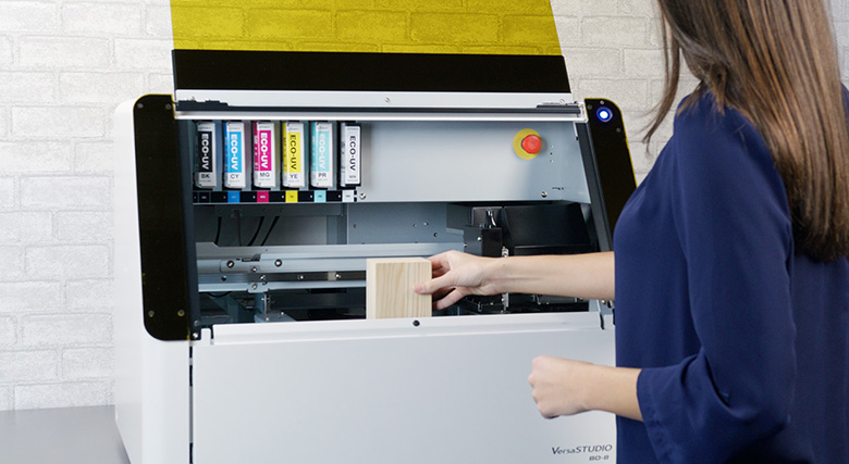 使用Roland BD-8,可以使用板載底漆墨水將設計打印到各種材料上,包括塑膠、紙張、皮革和木材,甚至玻璃和金屬。